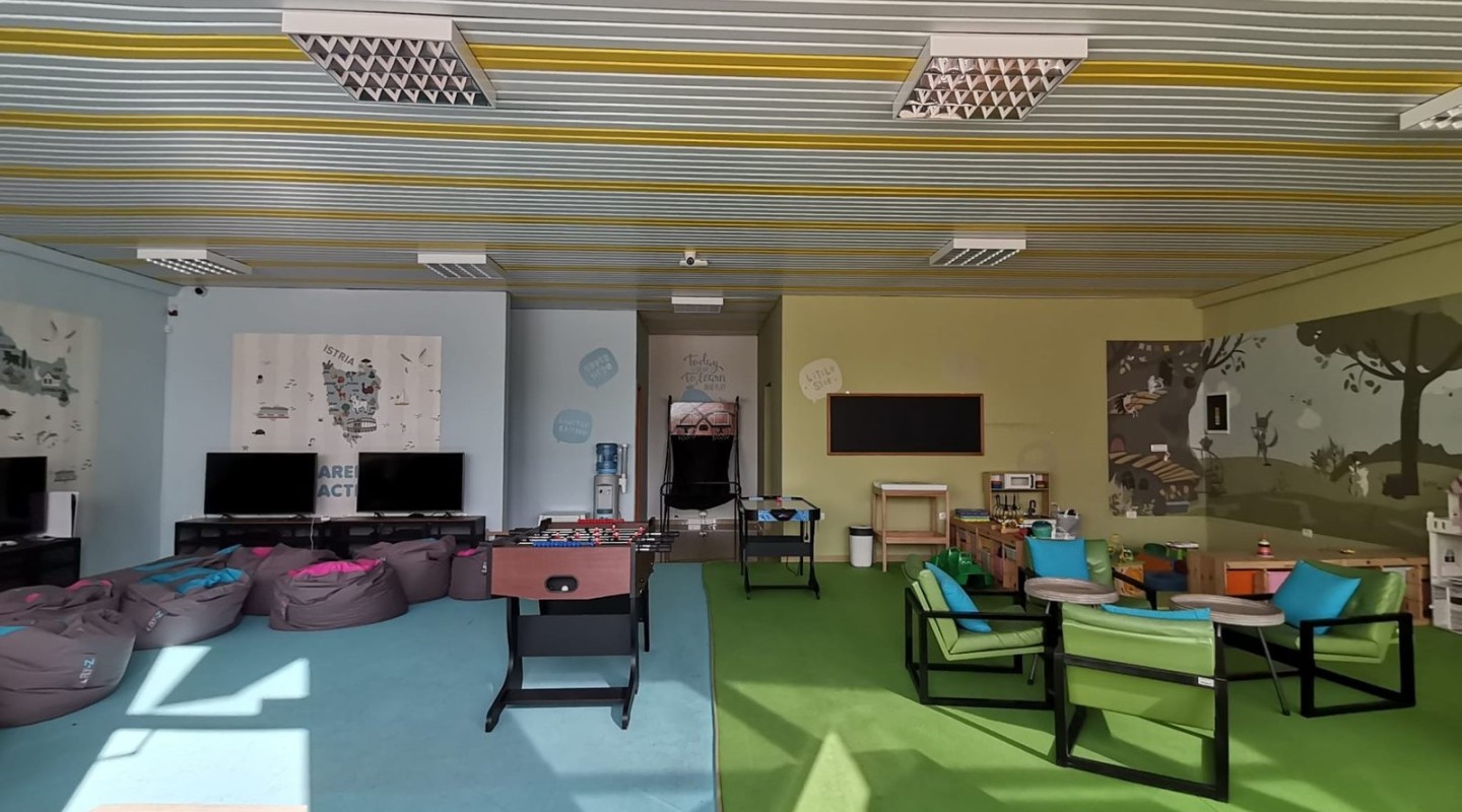 Prostor je podijeljen u nekoliko zona: multimedija - PS5; Zabavni i društveni kutak: stolni nogomet, košarka, hokej na ledu; društvene igre: kreativni kutak.
